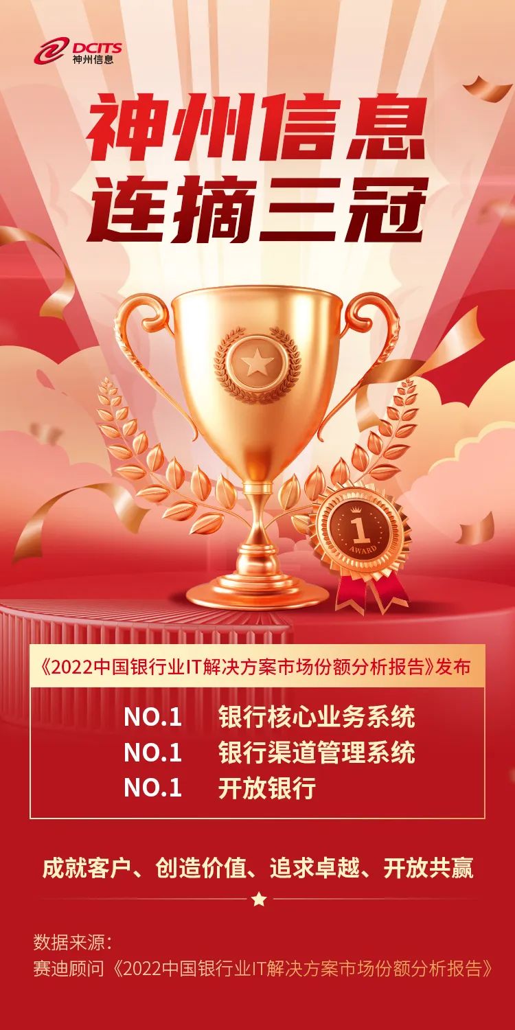 7月12日,工信部下属咨询机构——赛迪顾问正式发布《2022中国银行业IT解决方案市场份额分析报告》,神州信息凭借雄厚的金融数字化实力再次摘得多项市场第一。